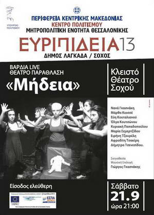 Ο Δήμος Λαγκαδά σε συνεργασία με το Κέντρο Πολιτισμού της Μητροπολιτικής Ενότητας Θεσσαλονίκης της Περιφέρειας Κεντρικής Μακεδονίας στα πλαίσια του θεσμού «ΕΥΡΙΠΙΔΕΙΑ 2013», το Σάββατο 21 Σεπτεμβρίου 2013 και ώρα 21:00, διοργανώνει, στην αίθουσα θεάτρου δημοτικού καταστήματος Σοχού, θεατρική παράσταση με το έργο « Μήδεια» από το θέατρο ΠΑΡΑΘΛΑΣΗ σε σκηνοθεσία Γιώργου Γκασνάκη.