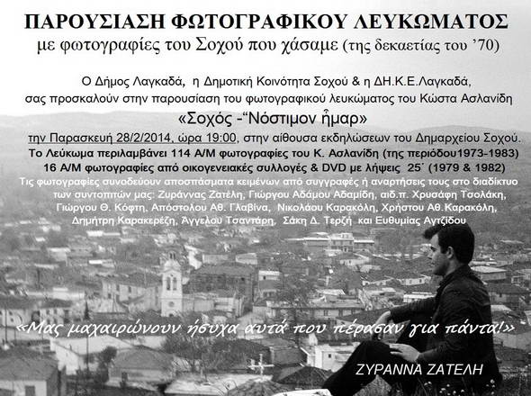 Ο Δήμος Λαγκαδά, η Δημοτική Κοινότητα Σοχού και η ΔΗ. ΚΕ. Λαγκαδά, σας προσκαλούν στην παρουσίαση του Φωτογραφικού Λευκώματος του Κώστα Ασλανίδη