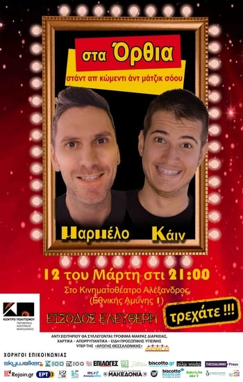 Μια βραδιά απόλυτου γέλιου Stand up Comedy και Magic show για ενήλικες. Δύο εξαιρετικοί καλλιτέχνες από την Θεσσαλονίκη αναλαμβάνουν να μας ξεναγήσουν στα μαγικά μονοπάτια του γέλιου. Έτσι λοιπόν αφήνουμε την σεμνοτυφία μας στην άκρη και σας καλούμε σε ένα show «…..στα Όρθια».