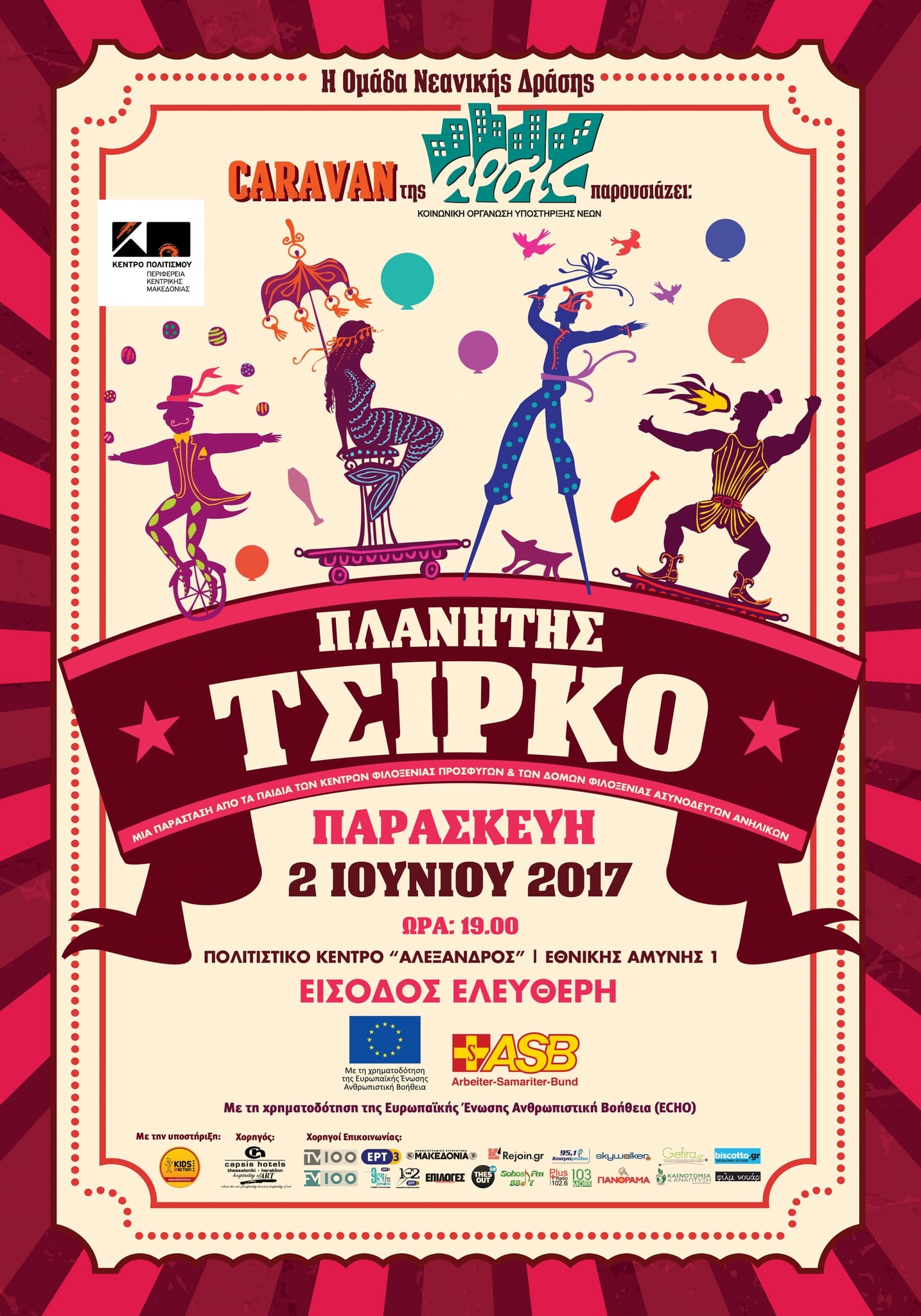 Η ΑΡΣΙΣ, Κοινωνική Οργάνωση Υποστήριξης Νέων και το Κέντρο Πολιτισμού της Περιφέρειας Κεντρικής Μακεδονίας παρουσιάζουν την Παρασκευή 02 Ιουνίου 2017 στις 19:00, στο Πολιτιστικό Κέντρο Αλέξανδρος, την παράσταση “Πλανήτης Τσίρκο”.